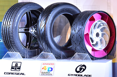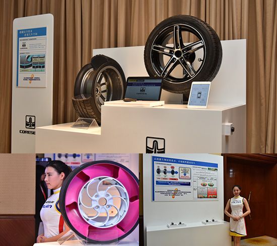 住友橡膠積極實踐“無備胎化”的節(jié)能理念,不斷推進(jìn)技術(shù)革新,研發(fā)出了非充氣輪胎和密封膠輪胎,實現(xiàn)了車輛的輕量化和空間最大利用化效果。非充氣輪胎技術(shù)“GYROBLADE”將金屬輪轂,特殊樹脂輪輻和橡膠胎面巧妙結(jié)合,實現(xiàn)了不需要填充空氣也能滿足行駛性能需求的技術(shù)。既避免了普通輪胎保養(yǎng)維護(hù)的負(fù)擔(dān),也為消費者提供多種色彩選擇,大大提升駕駛時尚感。密封膠輪胎技術(shù)“CORESEAL”在輪胎內(nèi)壁涂抹特殊材質(zhì)密封膠,當(dāng)輪胎遭遇異物刺入也能確保不漏氣,大大提升了輪胎的安全性能。