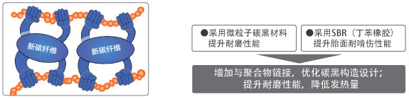即采用微粒子碳黑材料與SBR(丁苯橡膠)配方,增加與聚合物鏈接,優(yōu)化碳黑構(gòu)造設(shè)計,提升耐磨性能,降低發(fā)熱量。