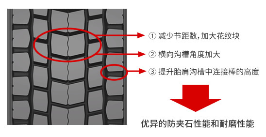 通過強(qiáng)化胎肩花紋塊剛性,從而提高高速行駛穩(wěn)定性;