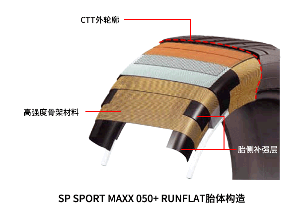 本次新上市的MAXX 050+ RUNFLAT,以“熱能控制技術(shù)”為依托,實(shí)現(xiàn)了在輪胎缺氣狀態(tài)下的安全續(xù)航。輪胎采用高強(qiáng)度的骨架材料,可有效減輕爆胎后的胎體變形,并控制胎側(cè)加固層的熱量產(chǎn)生;獨(dú)家CTT技術(shù),使用漸開線的輪胎形狀,通過胎側(cè)補(bǔ)強(qiáng)層的設(shè)計(jì)提高缺氣保用性能,通過圓形胎面部的設(shè)計(jì)提高其他一般性能,進(jìn)一步實(shí)現(xiàn)輕量化,同時也提升了駕駛的舒適性。