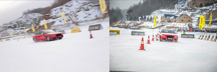 雪面測試項目中,參與人員同樣先將試駕的奧迪A4L加速至30km/h勻速行駛,當車輛行駛至預設的制動點,踩下制動踏板,相比冰面的測試,雪地制動反饋更加直接,車輛很快停止,WINTER MAXX02與以往產品的雪地制動均表現出色;在雪地繞樁項目中,WINTER MAXX02與以往產品的性能差距就明顯很多,無論是雪地操控還是橫向抓地性能,全面的提升讓安裝了WINTER MAXX02的車輛繞樁操控指向性更明確。