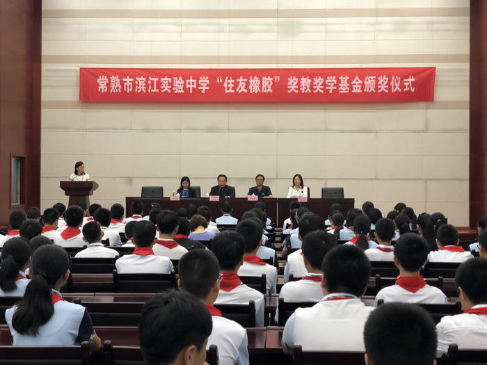 住友橡膠(中國)有限公司于2015年創(chuàng)立了“住友橡膠獎教獎學基金”,每年向常熟市濱江實驗中學捐贈5萬元人民幣,用于獎勵該校優(yōu)秀師生。住友橡膠董事長山田先生在頒獎致辭中表示:“獎教獎學基金設立的初衷,旨在獎勵認真投入教學事業(yè),精心培育青少年的各位教師,以及為不辜負老師期待,奮發(fā)向學,立志成才實現(xiàn)夢想的各位同學”。濱江實驗中學負責人代表全校師生向住友橡膠(中國)有限公司對發(fā)展當?shù)亟逃聵I(yè)提供的支持及幫助表達了由衷的感謝。