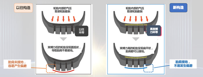 其次,該款產品的胎面橡膠優(yōu)化了橡膠種類和補強材料(炭黑)的使用量,盡可能地抑制了磨損。通過進一步地降低橡膠發(fā)熱性,實現(xiàn)降低滾阻從而減少油耗。另外,胎面內部采用新的結構——高束縛力環(huán)帶,提升胎面剛性,并使胎面更加扁平化,從而實現(xiàn)胎肩牢牢接地,提升耐偏磨性能。