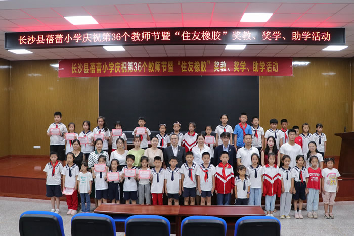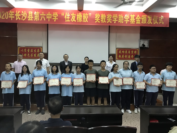 9月10日教師節(jié),住友橡膠(湖南)有限公司對(duì)長沙縣第六中學(xué)和長沙蓓蕾小學(xué)各捐贈(zèng)了獎(jiǎng)教獎(jiǎng)學(xué)基金,共計(jì)155名師生獲得獎(jiǎng)勵(lì)和資助。湖南公司總經(jīng)理舩原先生在頒獎(jiǎng)致辭中表示:“這場(chǎng)疫情,全國各地都在與其作斗爭(zhēng),不僅有奮戰(zhàn)在一線的醫(yī)務(wù)警務(wù)人員,也有在座為防疫做貢獻(xiàn)的老師、克服困難努力學(xué)習(xí)的學(xué)生們。‘住友橡膠獎(jiǎng)教獎(jiǎng)學(xué)基金’的設(shè)立,旨在鼓勵(lì)潛心教學(xué)、精心培育青少年的各位老師,以及獎(jiǎng)勵(lì)奮發(fā)努力、品學(xué)兼優(yōu)的各位同學(xué)。”長沙縣第六中學(xué)和長沙蓓蕾小學(xué)全體師生,向住友橡膠(湖南)有限公司對(duì)發(fā)展當(dāng)?shù)亟逃聵I(yè)提供的支持及幫助表達(dá)了由衷的感謝。