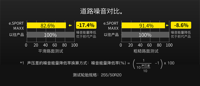 新品采用新一代變性聚合物搭配壓力控制技術(shù),減少行駛過程中不必要發(fā)熱,減少行駛過程中能量損耗,帶來理想的低滾阻性能和耐磨耗性能。同時為了達到人車合一的從容“靜界”,采用降噪花紋設(shè)計,并搭載住友橡膠研發(fā)的SILENT CORE降噪內(nèi)核技術(shù)。較以往產(chǎn)品相比,新品能夠有效緩解新能源汽車的胎噪問題。通過道路噪音對比實驗結(jié)果顯示*1,在平滑路面表現(xiàn)上,e. SPORT MAXX的降噪效果高于以往產(chǎn)品17.4%;在更加嚴苛的粗糙路面表現(xiàn)上則高出8.6%,全面遏制噪音,展現(xiàn)了出色的降噪性能。