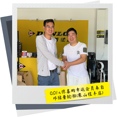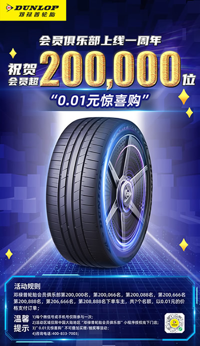 為答謝會(huì)員的支持,鄧祿普輪胎特別推出寵粉周年慶活動(dòng) —“0.01元驚喜購(gòu)”。 對(duì)鄧祿普輪胎會(huì)員俱樂部第200,000名、第200,066名、第200,088名、第200,666名、第200,888名、第206,666名、第208,888名下單車主,提供了以僅需0.01元的價(jià)格支付訂單的特別禮遇,共7個(gè)名額。