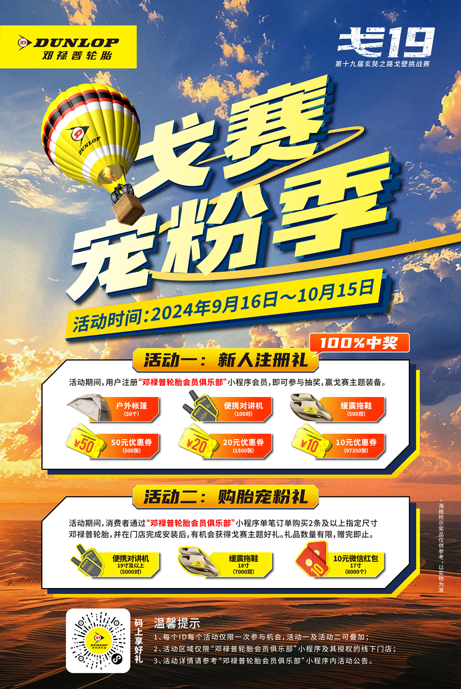 挑戰(zhàn)前路,向戈而行!鄧祿普為展示其“安全安心,一路守護(hù)”的品牌主張,還發(fā)布了雙重福利。9月16日-10月15日,首次注冊(cè)“鄧祿普會(huì)員俱樂(lè)部”小程序的新會(huì)員,可參與抽獎(jiǎng),贏取第十九屆玄奘之路戈壁挑戰(zhàn)賽專(zhuān)屬裝備;通過(guò)“鄧祿普會(huì)員俱樂(lè)部”小程序購(gòu)買(mǎi)指定輪胎,并在鄧祿普門(mén)店完成安裝后即有機(jī)會(huì)獲得戈賽主題好禮。專(zhuān)屬裝備和好禮包含優(yōu)惠券、緩震拖鞋、便攜對(duì)講機(jī)、戶(hù)外帳篷等。