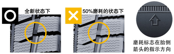 冬季輪胎的溝槽深度磨損至新胎花紋的50%以上后,就不可再作為冬季輪胎使用。胎側(cè)“↑”指示方向的胎面花紋溝內(nèi),設(shè)有表示磨耗程度的標(biāo)志。請(qǐng)確認(rèn)該磨耗標(biāo)志是否露出表面。