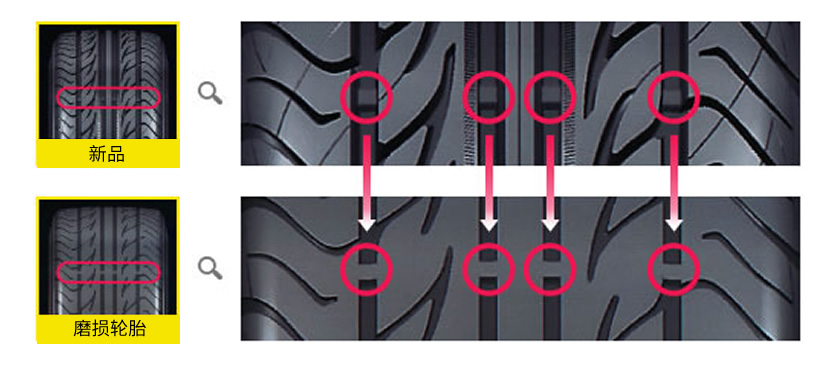 ● 當(dāng)磨耗指示標(biāo)記露出于凹槽時,則表示剩余溝槽深度為1.6mm,請務(wù)必盡快更換輪胎。